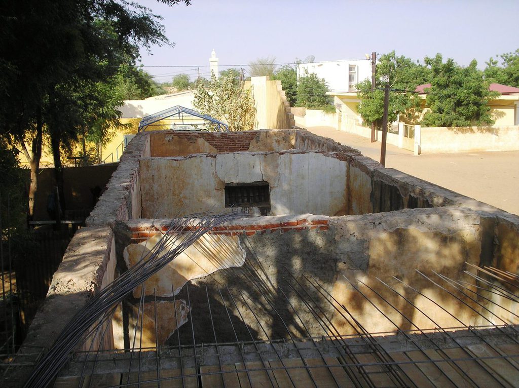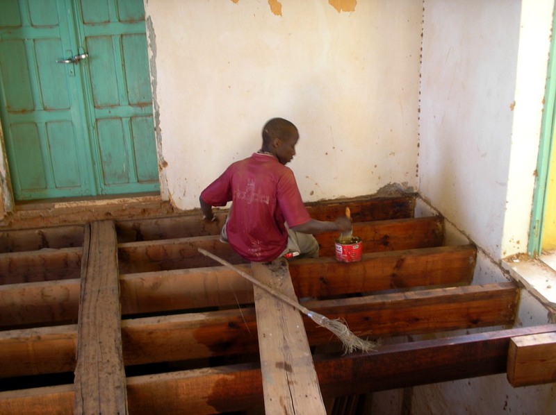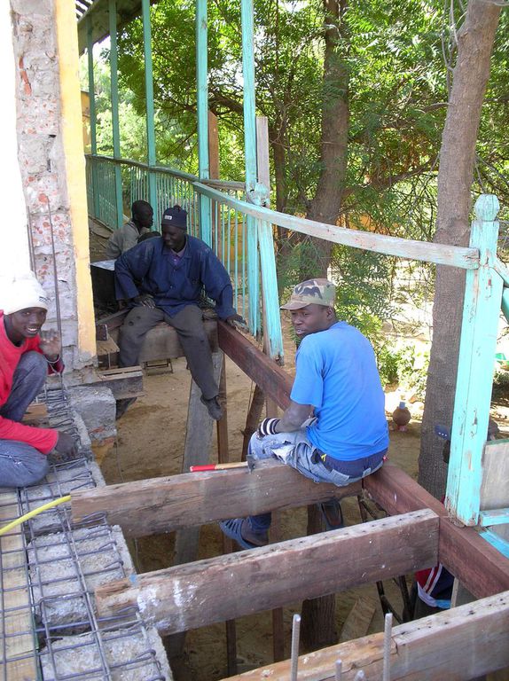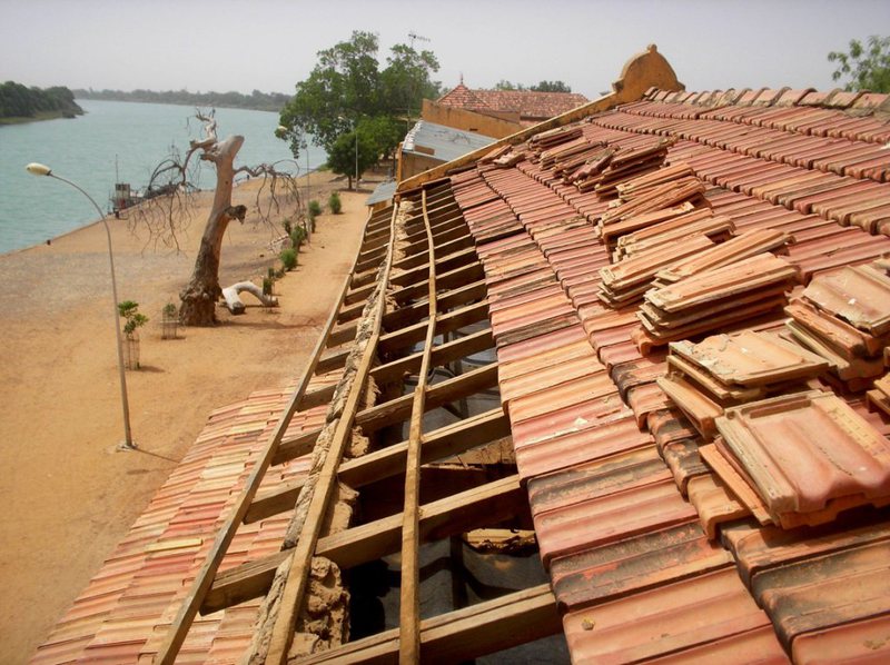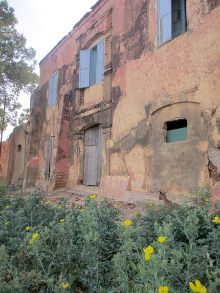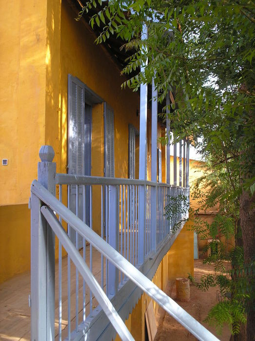 La maison, dans laquelle Anne Jean-Bart, une des futures copropriétaires, avait dormi une quinzaine d'années plus tôt, était abandonnée et, faute d'entretienn, sérieusement attaquée par les eaux de pluie. les plafonds et les plan chers des chambres de façade étaient détruits à 30%. La restauration de la maison s'est faite dans l'idée d'en faire une maison d'amis, une sorte de maison de campagne à la française, à 500 km de Dakar et près de 10 heures de route. Un projet fou qui a rapidement cédé la place d'une part à un programme de restauration plus important, du fait de l'état réel des locaux, et d'autre part à l'idée de créerdes chambres d'hôtes pour en amortir le coût et faciliter l'entretien. La restauration a été faite dans l'idée de conserver à la maison son esprit, ses ambiances, les matériaux, les couleurs, et d'une certaine façon, les volumes. Les entrepôts du rez-de-chaussée, notamment, ont été maintenus dans leur jus, avec leurs plafonds en vieilles planches de bois, leurs poutres, dont certaines rapiécées, leurs enduits cabossés. Certaines appendices qui défiguraient la façade ont été supprimées pour rendre au bloc central des trois chambres sa véritable dimension. La maison a conservé, avec ses ocres, un certain parfum de Méditerranée, de même que la fragilité de certains éléments d'architecture, tels que les galeries et escaliers en bois.