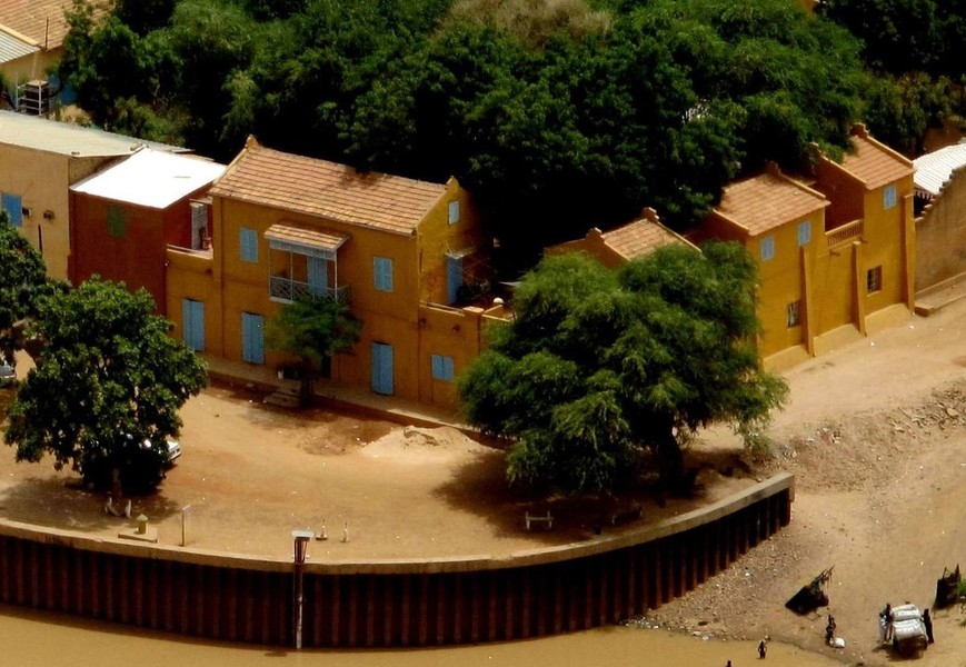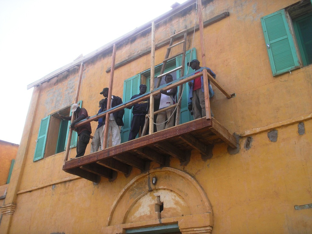 Parmi les spécificités architecturales des maisons et comptoirs du 19e siècle, il est important de mentionner les balcons, coursives fenêtres et portes en bois. Celui-ci était importé de France avec les bateaux quillés pour l'océan et qui remontaient donc jusqu'à Podor. Les petites marchandises, quant à elles, étaient transportées dans de vastes caisses de bois fabriquées avec un bois peu prisé en France, issu de la région de Bordeaux, le pitchpin. Les négociants et les colons les démontaient et se faisaient fabriquer leur mobilier, portes et fenêtres.