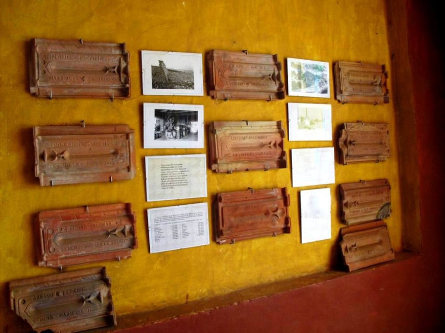 Par la suite, une partie des briques et des carreaux fut fabriquée sur place, à grands coups de déforestation. L'omniprésence des tuiles marseillaises nous a conduits à faire une recherche documentaire à Marseille que notre ami Hans Roeske a effectué avec zèle jusqu'à trouver à l'Estaque, où étaient autrefois établies les briqueteries, une somme d'informations passionnantes que nous avons restituées dans une petite exposition située au rez-de-chaussée de la maison (photo ci-dessus).